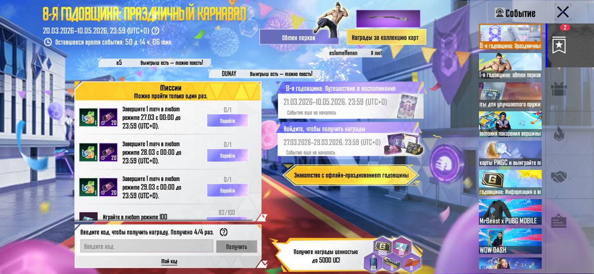 Введите код, чтобы получить награду PUBGM8YASINDA ILOVEPUBGM PUBGM#1CIRCLE PUBGM8TH