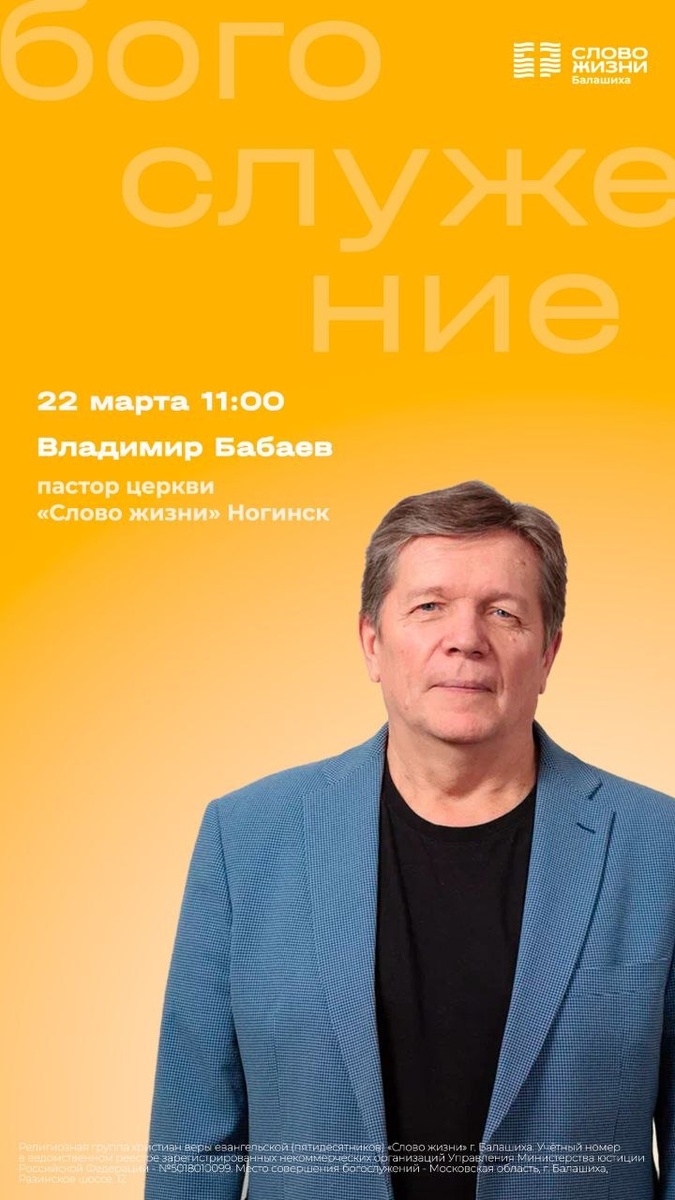 В воскресенье, 22 марта, на богослужении проповедует пастор церкви "Слово жизни" Ногинск Владимир Бабаев. Начало в 11:00.