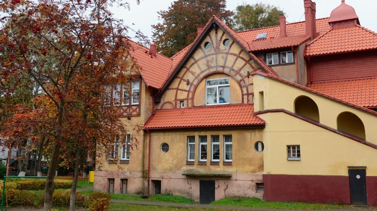 Далее идем на улицу Тельмана (бывшие Аугуста-Виктория Аллее и Герцог-Альбрехт-аллее). Мы в сердце Марауненхофа. Не все виллы на этой улице довоенные, многие появились здесь лишь в 90-е годы прошлого века и позже, но немало и настоящих, немецких. Например, вилла по адресу Тельмана, 13. Имени архитектора мы не знаем, очевидно, что построена она в начале XX века. В справочниках указывается, что это — югендстиль, немецкая разновидность модерна, но модерн не совсем обычный, а с вкраплением некой деревенской составляющей, речь идет о деревянной дранке, которую еще называют гонт. Гонт - это элемент отделки, который напоминает рыбью чешую, придает зданию теплоту, делает его более уютным, живым. Сейчас в этом здании детсад № 23.
