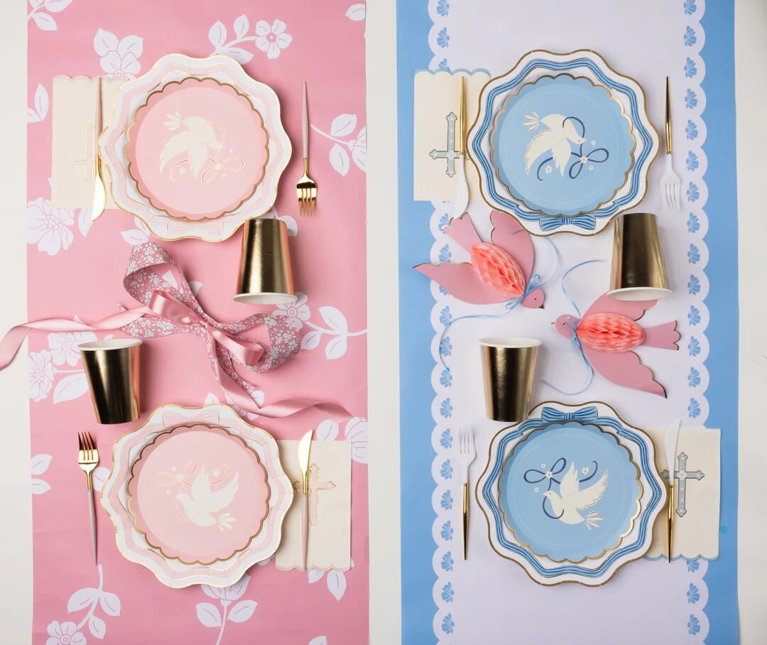 Такие религиозные события, как крещение, первое причастие и крестины, — это моменты, которые нужно ценить. Независимо от того, устраиваете ли вы небольшую встречу дома или праздничный прием после церковной службы, тщательно подобранный декор и сервировка стола помогут создать уютную атмосферу. В конце статьи мы оставим подборку пастельной посуды и жаров в розовых и голубых тонах! Стол — сердце праздника, ведь это место, где близкие люди собраются вместе, чтобы пообщаться и провести время друг с другом. Начните с создания спокойной атмосферы, используя свежие живые цветы и светлую скатерть. Затем добавьте сочетающиеся по цвету стаканы, тарелки и салфетки. Но не перегружайте сервировку деталями. Сделайте её минималистичной и простой. К розовому или голубому празднику подойдут золотые акценты, сделав оформление более торжественным! Это может быть что-то из посуды, столовые приборы, золотое конфетти или гирлянда. У нас можно найти как однотонную посуду, так и с нейтральными узорами, наприм