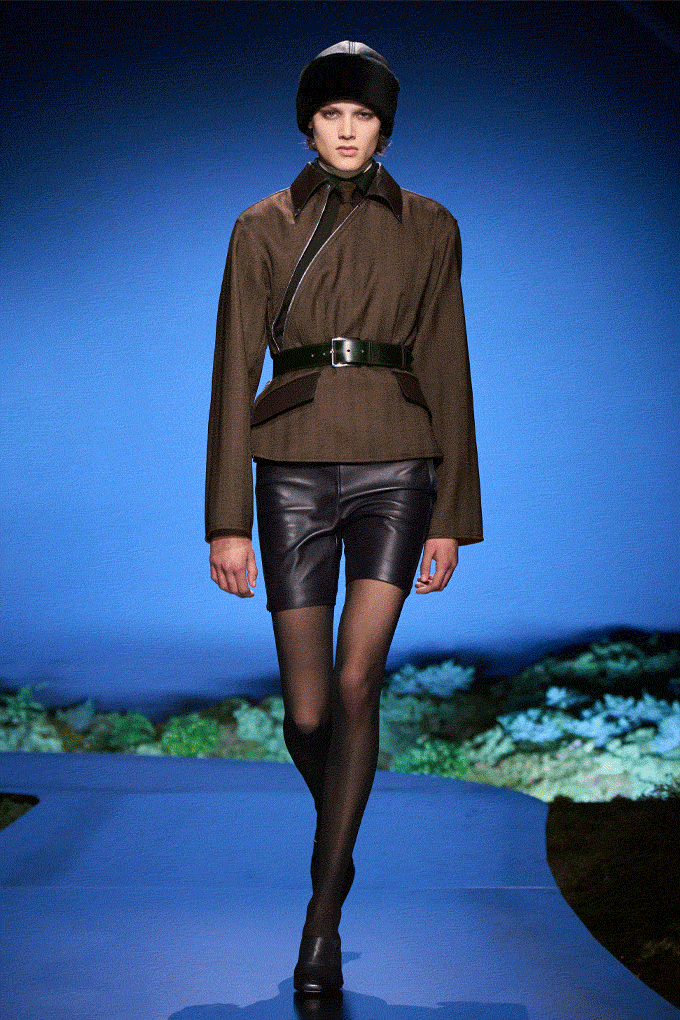 Надеж Ванье подошла к созданию коллекции осень-зима 2026 через то, что она назвала «пограничным миром», — пространство между днем и ночью. Сначала идея воплотилась в цвете. Теплые закатные тона постепенно сменялись темно-красным, темно-зеленым, чернильно-синим и серо-черным. Подиум, покрытый мхом, усиливал эту спокойную, пограничную атмосферу.