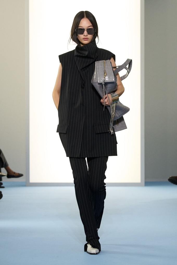 В этот раз было и то, и другое. Одним из приятных моментов шоу была его нестандартная структура: в центре была представлена вечерняя одежда, а в конце — повседневная в тонкую полоску. Было много необычных, но впечатляющих моделей верхней одежды, часто с огромными воротниками. Многие модели носили на шее колье-шаньер, напоминающие фляги, и серьги, похожие на большие пуговицы с кожаной отделкой. В образах 35 и 37 была представлена одна и та же объемная парка с подкладкой, но блестящая коричневая кожа и фиолетовая ткань менялись местами. Даже такие мелочи, как подол приталенного пиджака в форме рубашки, были довольно необычными.