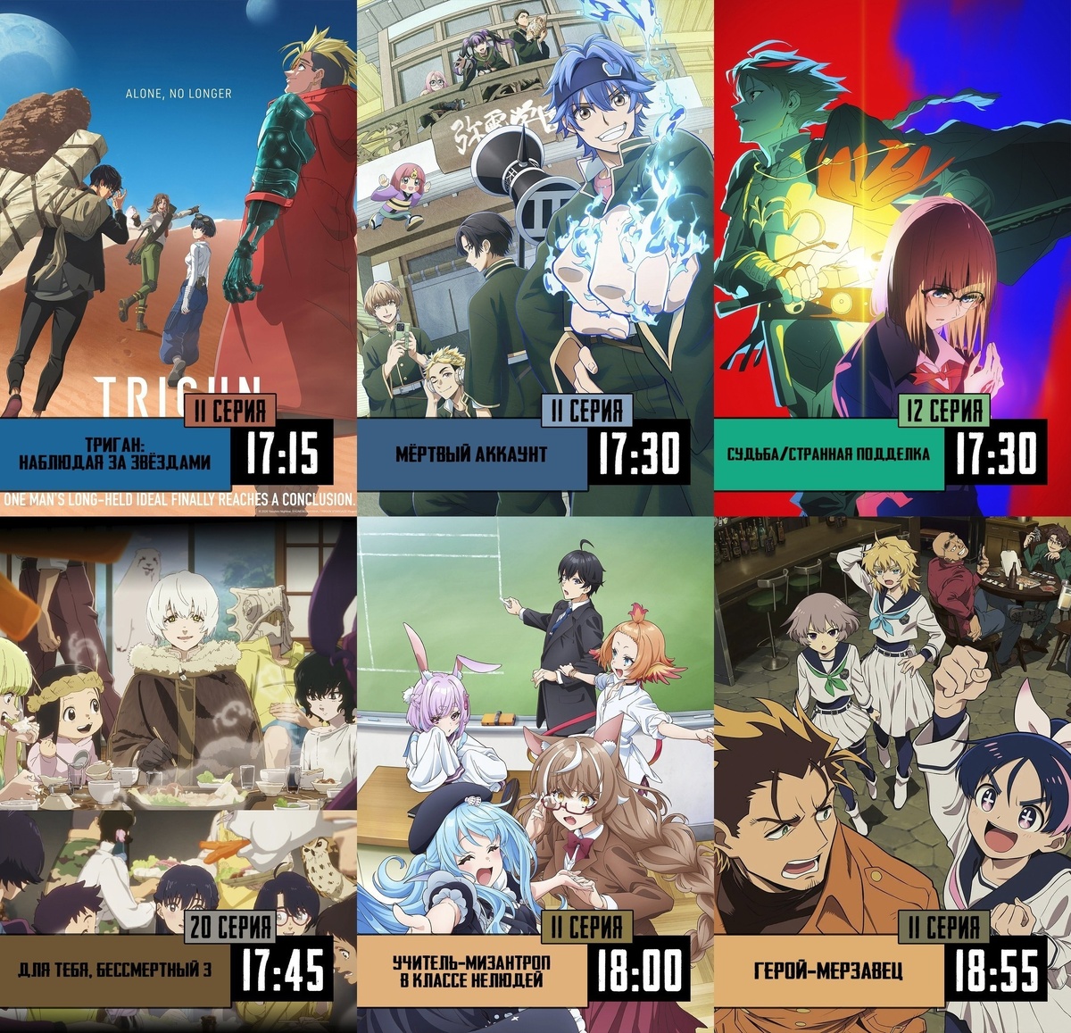 ⛔️По-порядку; 1) Триган: Наблюдая за звёздами 2) Мертвый аккаунт 3) Судьба/Странная подделка 4) Для тебя бесмертный 3-й сезон 5) Учитель-мизантроп в классе нелюдей: Хитома, не могли бы вы рассказать нам о людях...? 6) Герой-мерзавец ❗Онгоинг — аниме, серии которого выходят на данный момент.