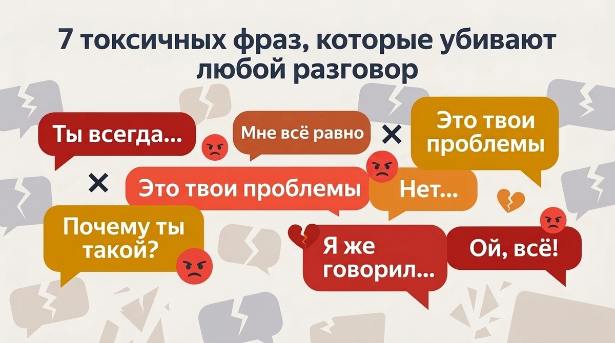 Знаете это чувство, когда разговор как-то не клеится? Вы вроде стараетесь, а собеседник закрывается или вообще уходит в телефон? Возможно, дело не в нём. Возможно, вы сами саботируете свои отношения — фразами, которые кажутся безобидными.