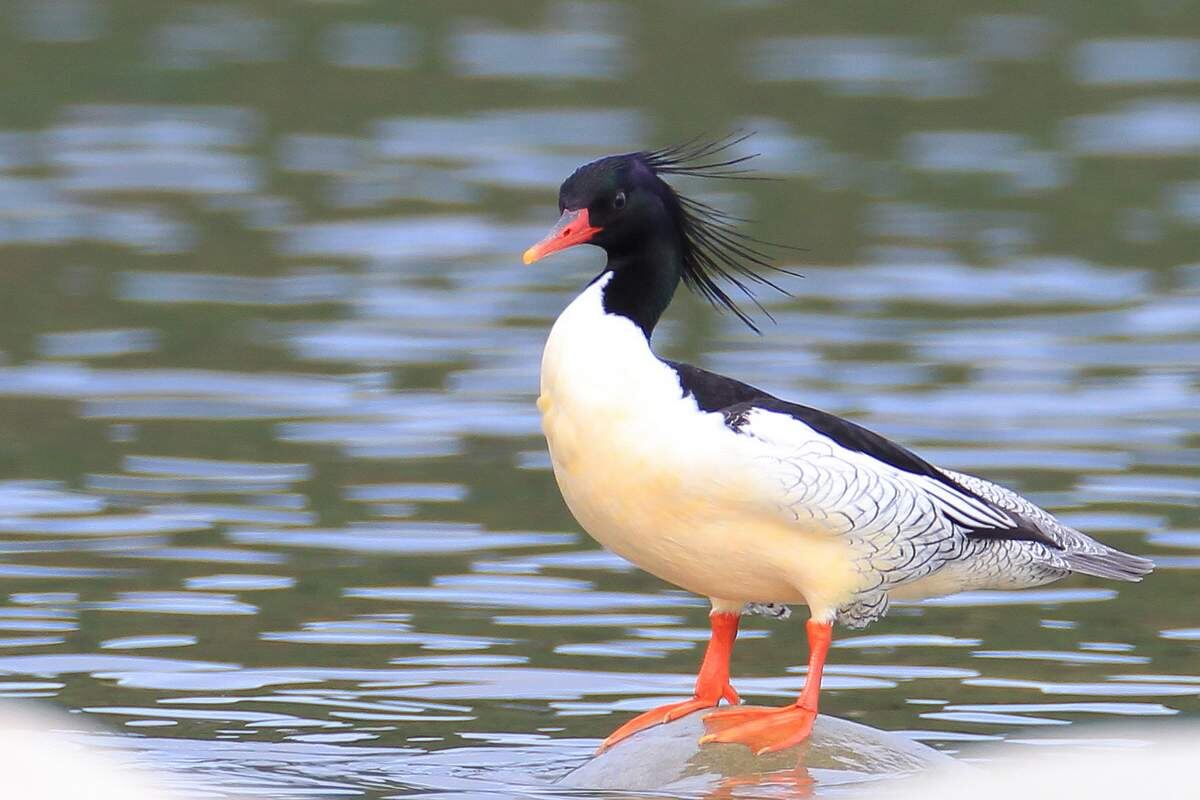 ❗️КРАСНАЯ КНИГА РФ. Редкий вид, эндемик юга Дальнего Востока.❗️ ВНЕШНИЙ ВИД Среднего размера крохаль. Самец в брачном наряде: • черно-белый • контрастный • голова выглядит черной, • а туловище белым • поднятый хохол торчит двумя пучками – на темени и на затылке, затылочные перья хохла ложатся на спину • зоб, грудь и бока белые • на боках заметны черные «скобки» • ноги ярко-красные • клюв длинный, узкий, красный с серо-желтым ноготком Самка: • светло-серая с рыжей головой • поднятый хохол также образует два пучка, но перья хохла короче • грудь и брюшко белые • а скобки на боках серые • глаза у обоих полов темные • ноги ярко-красные • клюв длинный, узкий, красный с серо-желтым ноготком В ПОЛЕТЕ Полет быстрый и маневренный, летит над рекой на высоте вершин деревьев. Белые зеркала и полосы на лопатках крупнее, чем у длинноносого крохаля, и меньше, чем у большого. Самец в полете отличим от других крохалей комбинацией признаков: крыловое зеркало трехраздельное, как у длинноносого крохаля, а