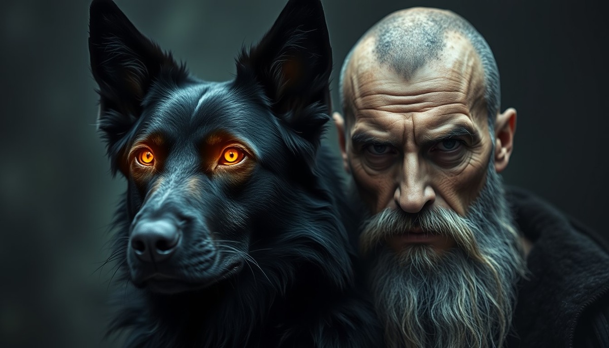 Пёс шагнул вперёд. Медленно, тяжело. Земля будто гудела под его лапами. Он не лаял, не скалился — просто смотрел. И в этом взгляде было что-то нечеловеческое. Древнее.