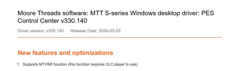 MTVSR улучшает уже декодированное видео прямо во время воспроизведения: убирает артефакты сжатия, повышает чёткость и масштабирует картинку. Поддерживаются MPEG-2, H.264, H.265 и AV1. Важно отметить, что к игровому рендерингу MTVSR отношение не имеет, для игр у Moore Threads есть отдельная технология MTAGR, но она пока не готова. Сам драйвер распространяется в альфа-версии, требует отключения Secure Boot и тестового режима Windows.