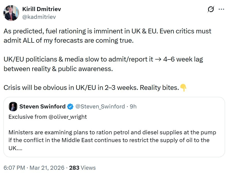 'Fuel rationing IMMINENT in UK & EU, as predicted' — Putin's envoy Dmitriev