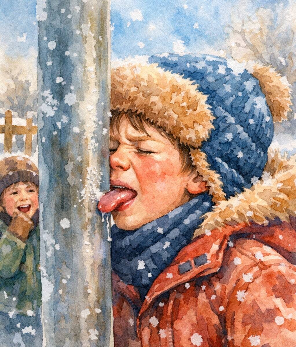 Зимой дети легко попадают в классическую ловушку: лижут качели, перила или металлическую горку — и язык мгновенно прилипает. Это не шутка и не просто неприятно: холодный металл быстро отнимает тепло, слюна замерзает, и слизистая буквально приклеивается к поверхности. ❗Самое важное в этот момент — не дёргать ребёнка и не пытаться оторвать язык силой. Резкий рывок почти всегда приводит к болезненному разрыву слизистой и кровотечению. 🤩Первый шаг — успокоить ребёнка и зафиксировать его, чтобы он не дёрнулся от паники. 🤩Дальше нужна постепенная разморозка. Самый простой и правильный способ — тёплая вода (не горячая): поливайте место прилипания небольшими порциями. 🤩Если воды под рукой нет, можно использовать тёплое дыхание, но этот способ медленнее: тёплый воздух постепенно растапливает лёд. 🤩Если есть возможность занести металлический предмет (например, санки) вместе с ребёнком в тёплое помещение, лучше так и сделать — в тепле язык отлипнет быстрее и безопаснее. Как только связь ос