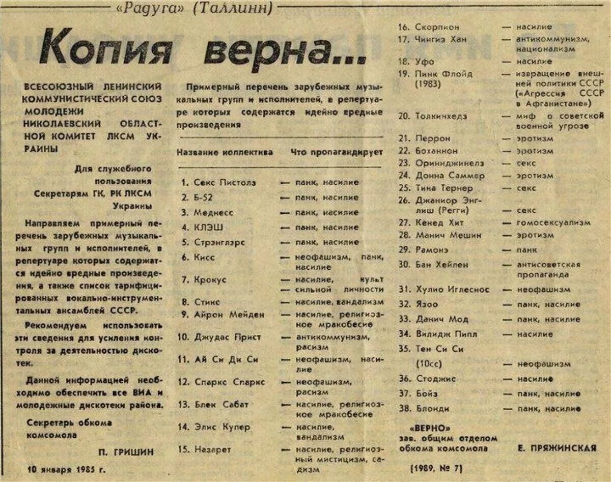 Попался на глаза документ 1985 года: Под раздачу попали даже "идейно вредные" Тина Тернер и Хулио Иглесиас. Тем паче "религиозные мракобесы" Black Sabbath и Iron Maiden. Хорошо хоть Depeche Mode пропустили: В сентябре 1984 года в «Комсомольской правде» вышла статья «Барбаросса рок-н-ролла»: Этого и ждут от нашей музыки пророки западных музыкальных волн — проповеди алкогольной темы, неприкрытого хамства, восторженного описания сладкой жизни, кончая, как мы убедились, откровенно религиозной пропагандой… И те, кто попадается на эту удочку, играют на руку нашим идейным противникам, несут вред отечественной молодежной музыке, откладывают в несформировавшихся умах ядовитые семена чуждого нашему обществу образа жизни, что ведет к моральной деградации. И это требует от всех нас самого активного отношения к музыкальным проискам западной пропаганды, разоблачению их и наступательности. Таким образом, ещё в середине 80-х рок-н-ролл опознавался советской системой как враг. А из теории всегда вытек