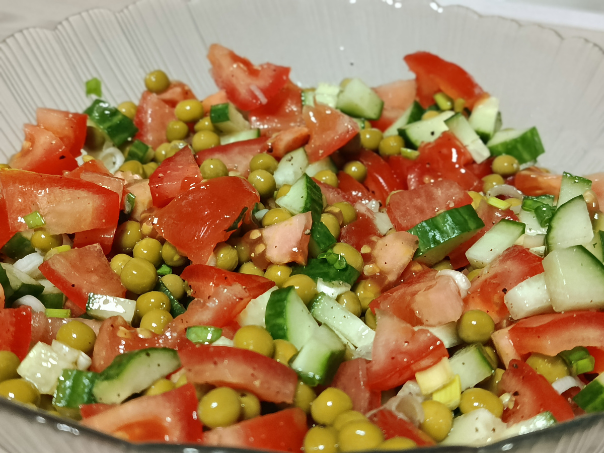 Быстрый и освежающий салат из огурцов, помидоров, зелёного лука и горошка — отличное решение для лёгкого обеда, гарнира или быстрого перекуса. Готовится за считанные минуты, не требует сложных ингредиентов и хорошо сочетается с разными блюдами.