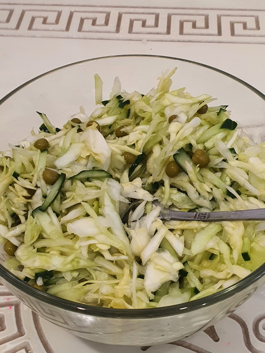 Доброе время суток, мой Дорогой читатель. Весна пришла ,весне дорогу. Как писал Александр Блок. О, весна без конца и без краю…О, весна без конца и без краю. Без конца и без краю мечта! Узнаю тебя, жизнь! Принимаю! И приветствую звоном щита! Сегодня будем готовить весенний салат из свежей капусты и огурцом. Но по традиции узнаем историю возникновения этого салата. История происхождения салата из свежей капусты и огурцов — это эволюция простой, доступной и здоровой пищи, корни которой уходят в европейские и славянские кулинарные традиции. Этот салат не имеет одного конкретного автора, а является результатом народной кухни. Вот такие факты мы узнали про салат. Приступим к готовке мой Дорогой читатель. Свежая капуста( или если нет то зимний сорт) половинка капуста 0,5 Свежий огурец -1 шт. Консервированный горошек -1 банка использовать 100 гр. Масло подсолнечное с запахом для заправки по вкусу Соль по вкусу Перец молотый по желанию 1.Огурец вымойте и обсушите бумажными полотенцами. О