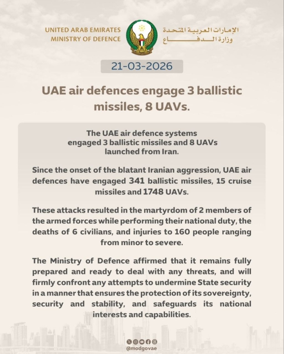 Today UAE intercepted 3 Iranian missiles and took down 8 drones — UAE MOD