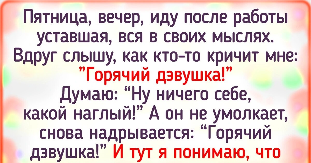 Пятница, вечер, иду после работы уставшая, вся в своих мыслях. А на дороге ремонт. И вдруг слышу, как кто-то из работников кричит мне: «Горячий дэвушка!» Иду дальше, думаю: «Ну ничего себе, какой наглый!» А он не умолкает, снова кричит: «Горячий дэвушка!» И тут я понимаю, что иду по только что утрамбованному, накатанному, горячему асфальту...