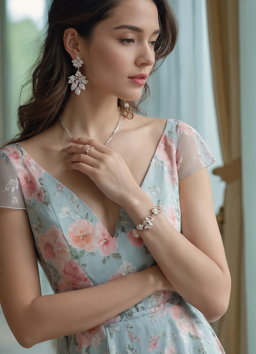 При выборе украшений к платью с цветочным принтом следует учитывать гармонию между деталями. Для легких и воздушных моделей подойдут изящные серьги или тонкие браслеты из серебра и золота. Такие аксессуары подчеркнут романтичный характер наряда, не перегружая образ. Обилие цветов в принте может потребовать минимализма в украшениях, чтобы не создать визуальный хаос.