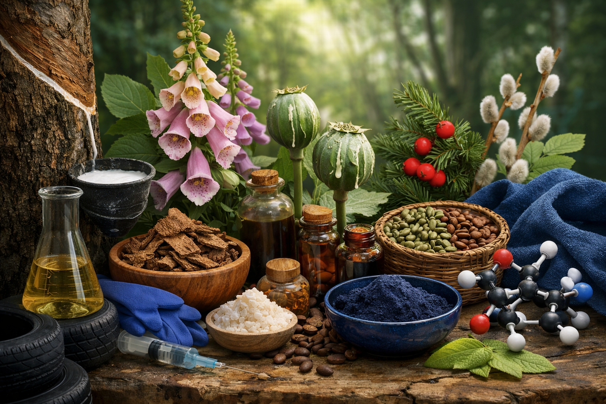 Самые неожиданные вещества из растений — это не просто редкая химия. Многие из них давно стали частью обычной жизни. Из гевеи получают каучук для шин и перчаток, из древесины и хлопка — целлюлозу для бумаги и ткани, из коры цинхоны — хинин, из белладонны — атропин, из мака — морфин, из наперстянки — дигоксин, из тиса — паклитаксел, из красильных растений — индиго, из кофе и чая — кофеин, из ивы — салицин.