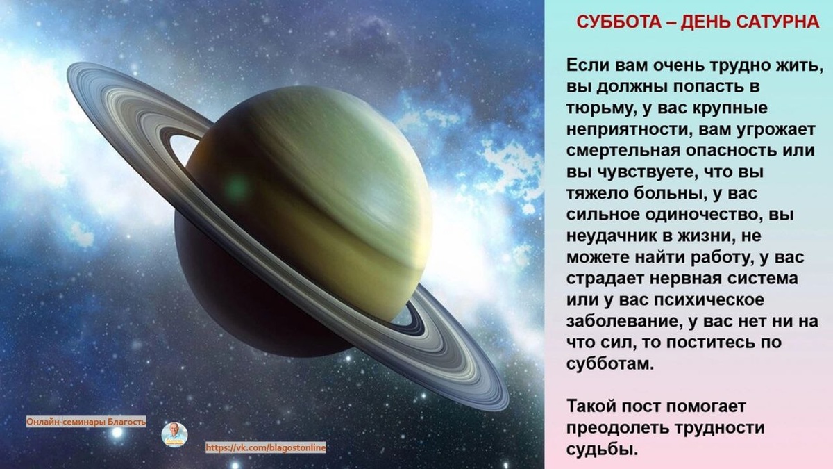 Если вам очень трудно жить, вы должны попасть в тюрьму, у вас крупные неприятности, вам угрожает смертельная опасность или вы чувствуете, что тяжело больны, у вас сильное одиночество, вы неудачник в жизни, не можете найти работу, у вас страдает нервная система или у вас психическое заболевание, у вас нет ни на что сил, то поститесь по субботам. Такой пост помогает преодолеть трудности судьбы. 💬 Мы в мессенджере МАХ