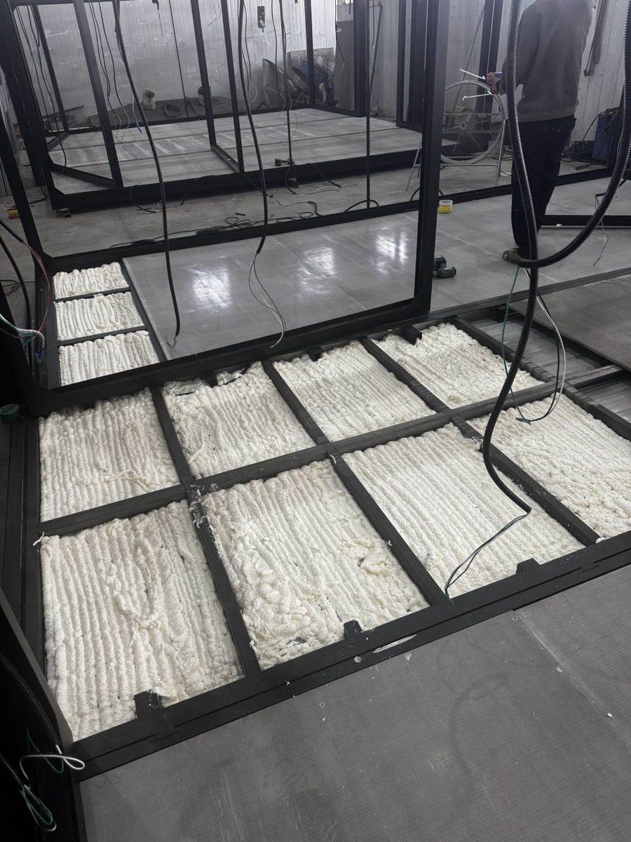 подготовки нижней части наших каркасов в зимнему времени. Напомню, что все дома, поставляемые в Россию, обязательно включают в себя зимний пакет, призванный обеспечить комфортное проживание в доме в холодный период. Одним из ключевых элементов является дополнительное утепление нижней части каркаса негорючим материалом : Пенополиуретаном в заводских условиях. Еще одним элементом дополнительной защиты выступает дополнительный проф лист по нижней части (в летних вариантах он не комплектуется), потом идет нанесение слоя ППУ (до 100 мм по всему днищу). Далее укладывается Glass Magnesium Board (стекломагниевый лист, GMB) — листовой отделочный материал, который используется в строительстве и отделке. Основу материала составляет магнезит в сочетании с оксидами, хлоридами и карбонатами магния. В процессе производства композиция наносится на армирующую основу, чаще всего из стеклоткани, что придаёт изделию прочность и стабильность. Материал относится к классу НГ (негорючий) и выдерживает воздей