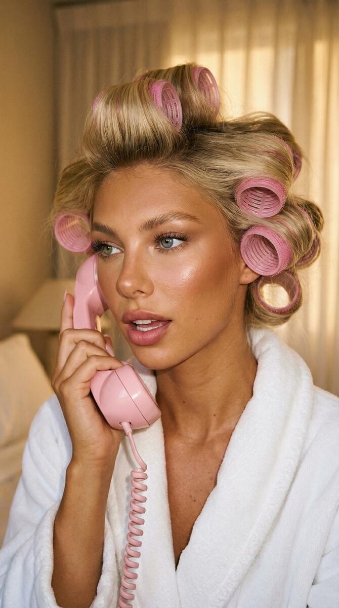 ✨✨✨✨✨✨✨✨✨✨ ✨ зайди в бот @aibudka_bot ✨ отправь фото (где хорошо видно лицо) и открой редактор ✨ выбери нейросеть Nano Banana (обязательно PRO-режим для топ-результата) ✨ установи качество 2К, соотношение сторон 9:16 (или другой формат по вкусу) ✨ вставь этот промпт (просто нажми, чтобы скопировать): Preserve the exact facial identity, all features, eye color, hair color, and overall appearance from the reference image. Close-up portrait of this woman talking on a pink retro landline phone, holding the handset to her ear with one hand. Hair in large pink rollers with volume. Radiant tanned skin, bronzed glow, highlighter on cheekbones, groomed brows, long lashes, neutral eyeshadow, pink lips. Animated expressive face, mid-conversation. White cozy bathrobe. Warm golden ambient light, blurred bedroom interior with soft curtains in background. Retro getting-ready moment, vintage diva aesthetic, 90s vibes. Analog film, warm golden tones, soft grain, shallow depth of field. ✨ @aibudka_bot