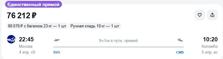 Несмотря на 20 дополнительных рейсов, заявленных «Аэрофлотом» из Москвы на Шри-Ланку на весенние даты, расширение предложения пока не привело к удешевлению билетов. Во всяком случае, на начало апреля. Например, места на борту отправлением в Коломбо 4 апреля стоят 76 тыс., а с багажом – все 86 тыс. руб. Самая бюджетная альтернатива со стыковкой в аэропортах не ближневосточных стран – тем же российским нацпером до Мале, а далее на Шри-Ланку – мальдивским лоукостером FitsAir: 50 тыс. руб. плюс 10 тыс. за перевозку чемодана. Наличие билетов и цены мы проверяли в 14:30. О других вариантах с пересадками читайте на ТурДоме. @tourdom