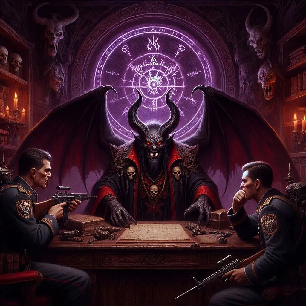 Кабинет Саллоса. В центре — массивный стол из тёмного камня, за которым восседает сам Саллос, демон с величественной осанкой и проницательным взглядом. В углу, свернувшись калачиком, мирно спит крокодил Саллиэль, иногда вздрагивая во сне. По правую руку от Саллоса стоит Хиариил, его первый заместитель, с выражением усталой строгости на лице. Слева — Ургетариил, заведующий лабораториями, перебирающий какие-то свитки.