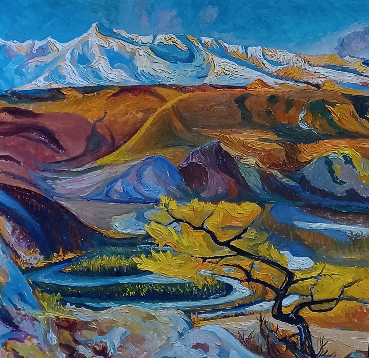 Горный алтай Холст/масло 60х60 Работа из цикла "Малая Родина друга". Мне не довелось побывать на Алтае, все работы горного Алтая написаны на основании многочисленных фотографий друга, к сожалению уже ушедшего из жизни, и посвящены ему. (Подробнее см. проект "Фантазия-1") [Клуб Успешных Художников: VerbArt Top 100]