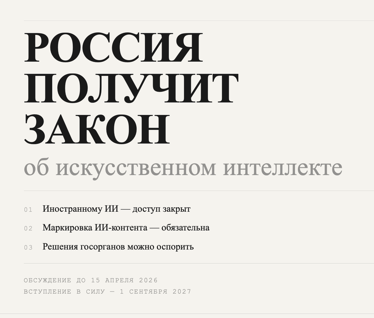 17 марта Минцифры опубликовало проект федерального закона о регулировании искусственного интеллекта. Документ касается всех: разработчиков, бизнеса, госорганов и обычных пользователей. Вице-премьер Дмитрий Григоренко, комментируя документ РБК, сформулировал главный принцип: "Для нас главное — соблюдение баланса между защитой интересов граждан и развитием технологий." Пока это только проект. Публичное обсуждение открыто до 15 апреля. Если всё пойдёт по плану, закон заработает 1 сентября 2027 года. Жёсткость зависит от сферы В коммерческом секторе обязательных требований по использованию ИИ не будет. Для госуправления и других чувствительных сфер появятся отдельные требования. По словам Григоренко, строгость правил будет зависеть от того, насколько сильно та или иная ИИ-система влияет на жизнь людей. Три новых категории Вводятся понятия суверенной, национальной и доверенной модели ИИ. В госсистемах и на объектах критической инфраструктуры можно будет использовать только модели из реестр