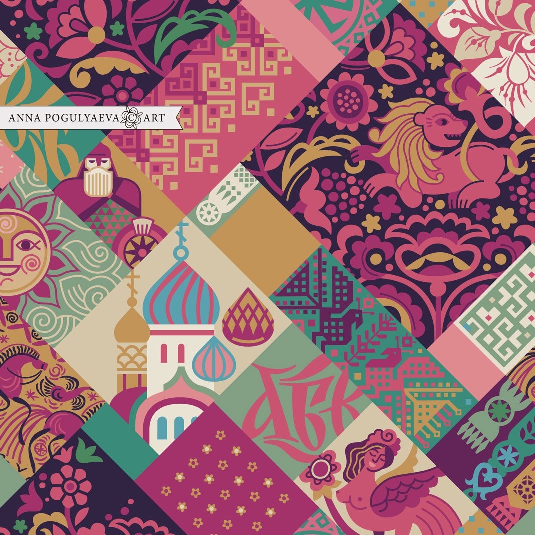 Собираю материалы, компоную, ищу самый выгодный и выразительный ракурс, стилизую, отрисовываю сложные элементы. Ловлю вдохновение за хвост. Ориентируюсь на размеры элементов в эскизе - иначе можно перестараться и перемельчить. А, следовательно, все придется перерисовывать. Это огромная работа. Потом собираю элементы воедино. И тут часто возникает затык. Цвета! А глаз уже замылился, не видит. Нет свежести восприятия. Взяла пару выходных - отвлекаюсь, шуршу по забытому хозяйству, прибираю, выбрасываю, хожу глазеть по строительным магазинам. Ем, кормлю семью. Готовлюсь активно поработать с цветом. Процесс поиска нового цветового решения. Мой бесшовный принт для ткани «Русский пэчворк» с русскими символами и геометрическим орнаментом, имитирующим лоскутное шитье. Можно использовать для упаковки, одежды, аксессуаров, интерьерного и кухонного текстиля. #векторнаяиллюстрация #русскийстиль #принтдляткани #художник #дизайнер @AnnaPogulyaeva_Art
