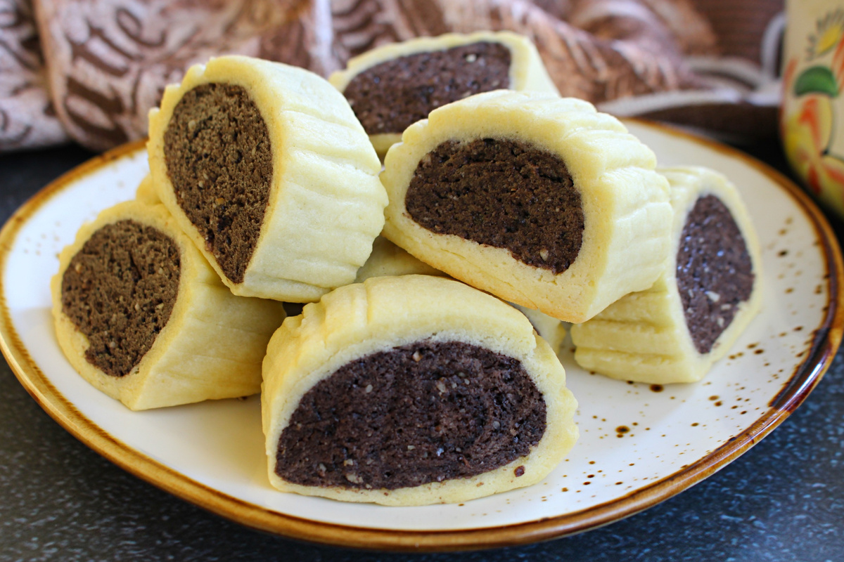 Это печенье вроде готовится из простых и привычных продуктов, а получается оно очень необычное. Печенье мягкое, ароматное, вкусное со слегка влажной шоколадной начинкой. Стоит, обязательно стоит попробовать такую выпечку! Она понравится и любителям просто сладкого домашнего печенья, и любителям шоколадных лакомств. Из данного количества ингредиентов получается много печенья и оно еще весьма сытное. Примерно у вас выйдет 30-32 штуки довольно толстеньких тяжеленьких печенек. Как всегда, заранее достаньте сливочное масло из холодильника, чтобы оно стало мягкое. Масло сливочное - 250 г. Пудра сахарная - 180 г. Разрыхлитель - 1 ч.л. Ванильный сахар - 1 ч.л. Соль - щепотка Яйцо куриное - 1 шт. Мука - 450 г. Какао-порошок - 1 ст.л. Орехи грецкие - 40 г. В чашку выложим сахарную пудру, разрыхлитель и мягкое сливочное масло. Добавим в чашку соль, ванильный сахар или ванильный экстракт, вбиваем яйцо и перемешиваем. Добавим муку и замешиваем мягкое тесто. Оно не липнет к рукам. Разделим тесто на
