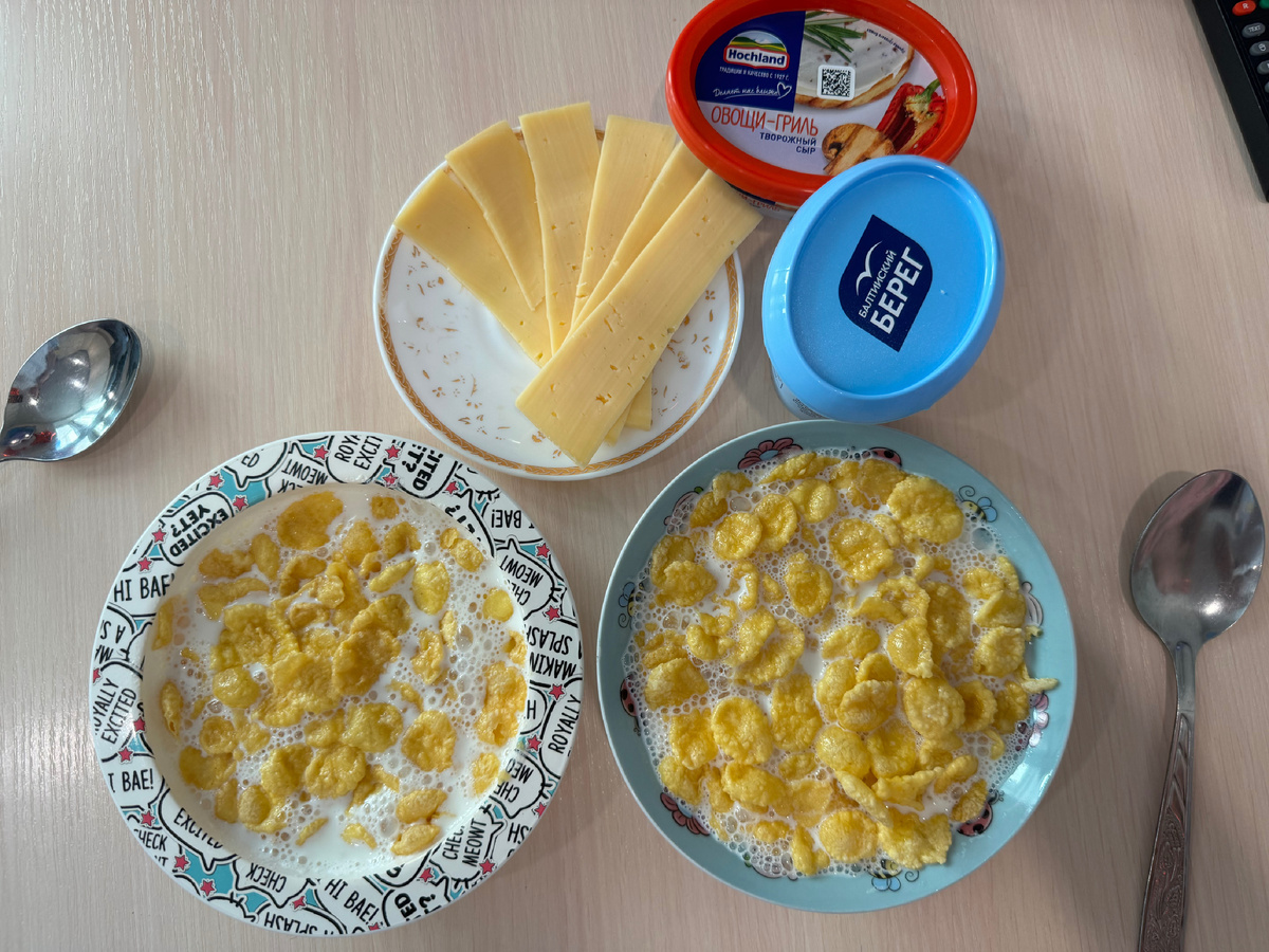 На завтрак ели хлопья с молоком, сыр и разные намазки на хлеб. Дочка что-то не очень себя чувствовала, то ли вирус, то ли что-то съела не то, поэтому особо не ела. Через пару часов отошла и появился аппетит🥹🙏