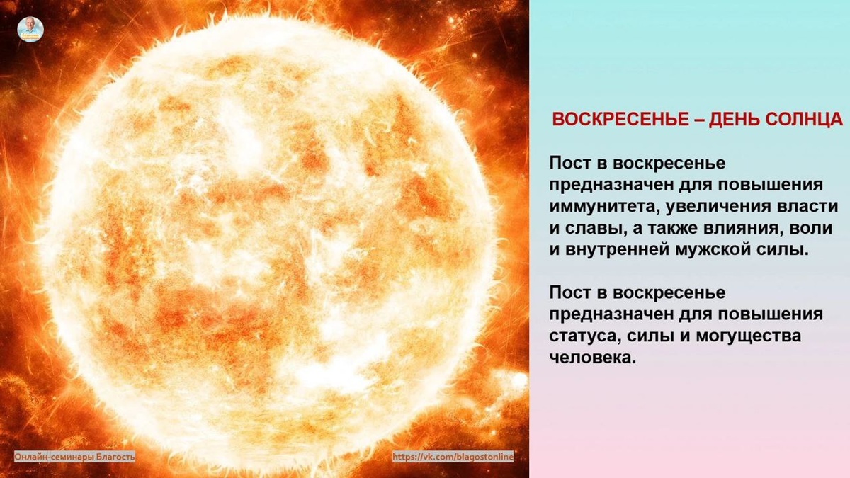 Пост в воскресенье предназначен для повышения иммунитета, увеличения власти и славы а также влияния, воли и внутренней мужской силы.