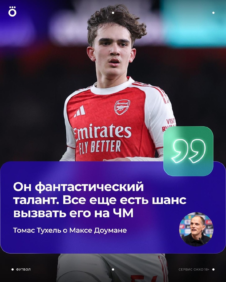 Томас Тухель рассматривает эту возможность 🏴 Но главный тренер сборной Англии добавил, что Доуману нужно побороться за игровое время в «Арсенале». Увидим ли мы этого вундеркинда на ЧМ? 🏆 😃 Смотри Okko прямо сейчас!