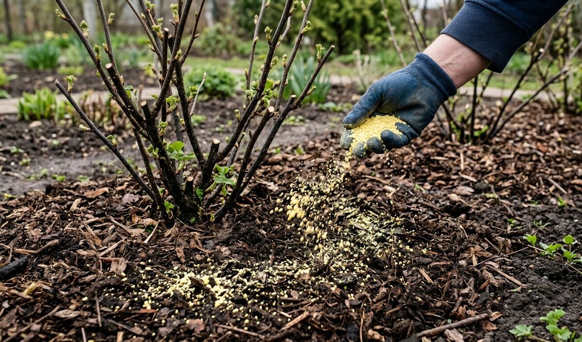 Вносите его сразу после схода снега, используя сухой способ — рассыпая по приствольному кругу. Для усиления эффекта смешивайте с горчичным жмыхом. Норма на взрослый куст — 100–150 грамм.