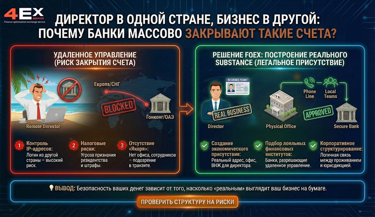 🌍 ДИРЕКТОР В ОДНОЙ СТРАНЕ, БИЗНЕС В ДРУГОЙ: ПОЧЕМУ БАНКИ МАССОВО ЗАКРЫВАЮТ ТАКИЕ СЧЕТА
