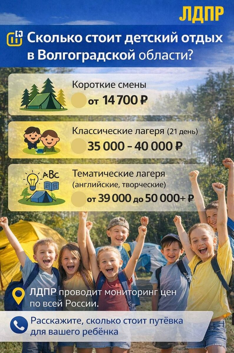 Инициатором масштабного мониторинга по всей стране выступил Председатель партии Леонид Слуцкий. Наша задача — собрать объективные данные «с земли», чтобы подтвердить позицию, которую лидер ЛДПР представит на пленарном заседании Государственной Думы. Несмотря на то, что на дворе только конец марта, для многих родителей школьников Волгограда уже актуален вопрос приобретения путёвок в детские лагеря. Мы изучим цены и условия, которые предлагают организаторы детского отдыха. По данным открытых интернет-источников, стоимость путёвок на лето 2026 года начинается от 14 700 рублей за короткие смены и от 35 000–40 000 рублей за полноценные 21-дневные заезды в загородные лагеря. Популярные тематические смены — языковые, творческие — стоят дороже: от 39 000 до 50 000 рублей и выше. В рамках мониторинга мы проверим, соответствуют ли эти данные реальной ситуации, а также выясним, сколько родители готовы потратить на отдых своих детей. А вы уже узнавали, сколько будет стоить отправить ребёнка в