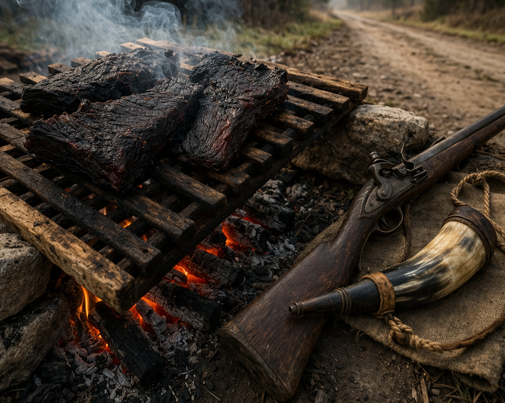 Мясо не только коптили — предварительно его натирали солью и перцем, иногда добавляли местные специи и сок лайма. Это был не гастрономический каприз, а технология: соль вытягивала влагу, кислота замедляла размножение бактерий. Готовый продукт был жёстким, сухим, очень солёным и очень вкусным — по свидетельствам современников, в том числе тех, кто ел его впервые без всякого восторга, но потом возвращался снова.