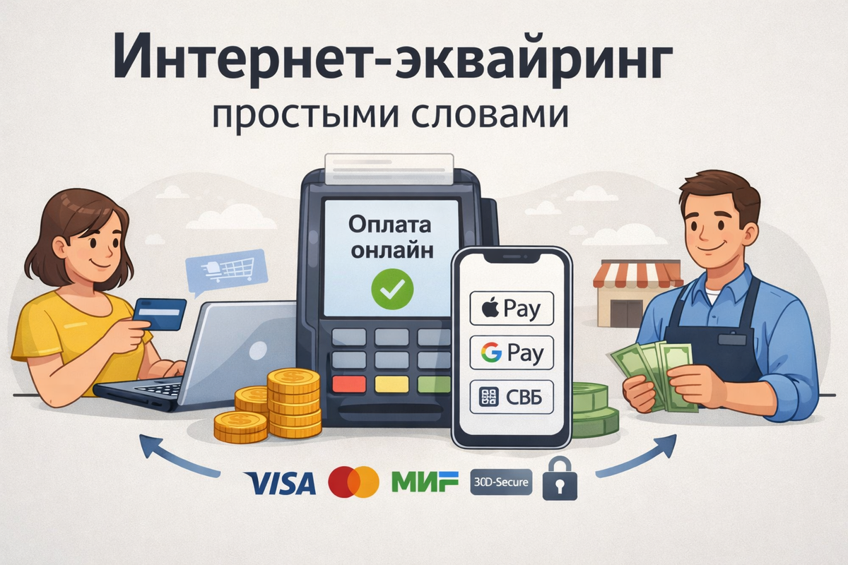 Интернет-эквайринг — это способ принимать оплату банковскими картами и другими онлайн-методами прямо на сайте, в приложении или через платёжную ссылку. Проще говоря: 👉 это система, которая позволяет клиенту заплатить онлайн, а бизнесу — получить деньги. Представьте, что у вас есть интернет-магазин. За всем этим стоит интернет-эквайринг — он связывает: В интернет-эквайринге всегда есть несколько участников: 1. Покупатель Человек, который оплачивает заказ. 2. Продавец (бизнес) Сайт, сервис или магазин. 3. Банк-эквайер Банк, который принимает платежи (например, Тинькофф, Сбер). 4. Банк-эмитент Банк, который выпустил карту клиента. 5. Платёжная система Visa, Mastercard, МИР и т.д. Современные системы позволяют принимать: 👉 Чем больше способов оплаты — тем выше конверсия. Без него онлайн-бизнес фактически не может нормально работать. Основные задачи: Обычно комиссия составляет: Но зависит от: Вы подключаетесь напрямую к банку. Плюсы: Минусы: Например: ЮKassa, Robokassa и др. Плюсы: Минусы