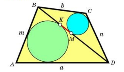 Кажется, не требует обоснования мысль, вынесенная в заголовок заметки. Если ученик владеет методом, то он выведет и формулу. а если не владеет, то может ошибиться в воспроизведении формулы и не решит задачу. Покажем это на примере задачи, разобранной на канале Валерия Казакова. Она дана под заголовком «Расстояние между точками касания». Итак задача. 1. В четырёхугольнике ABCD проведена диагональ BD и заданы длины сторон: AD = a, BC = b, AB = m, CD = n. В треугольники ABD и BCD вписаны окружности, касающиеся диагонали BD в точках K и M соответственно. Найдите длину отрезка MK. На канале приведено текстовое решение задачи с использованием теоремы о нахождении расстояния от вершины треугольника до точки касания вписанной окружности. В решении задачи всё хорошо, кроме одного: в стрессовой ситуации олимпиады или экзамена ученик может «криво» воспроизвести по памяти используемую формулу. Покажем метод доказательства упомянутой теоремы, его мы применим при решении задачи. Источник. Расстояние