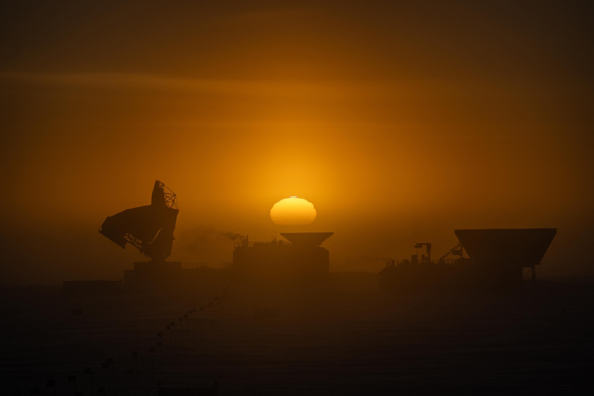 Так выглядело Солнце над южным полюсом 20 марта 2024 года, в день равноденствия. Если бы у Земли не было атмосферы, над горизонтом была бы видна примерно половина солнечного диска. Но атмосфера работает как гигантская линза: она преломляет солнечные лучи, из-за чего наше светило кажется немного выше своего реального положения. Равноденствие наступает в момент, когда центр солнечного диска пересекает небесный экватор. Для Северного полушария это означает начало астрономической весны, а для Южного — начало астрономической осени. В кадр также попал Южный полярный телескоп — 10-метровый радиотелескоп, расположенный на территории постоянно обитаемой американской станции "Амундсен-Скотт", которая находится точно на географическом южном полюсе. Южный полюс — одно из лучших мест на Земле для наблюдений в миллиметровом диапазоне — части электромагнитного спектра между инфракрасным и радиодиапазоном. Именно в нем особенно хорошо изучаются реликтовое излучение, холодный межзвездный газ, горячий г
