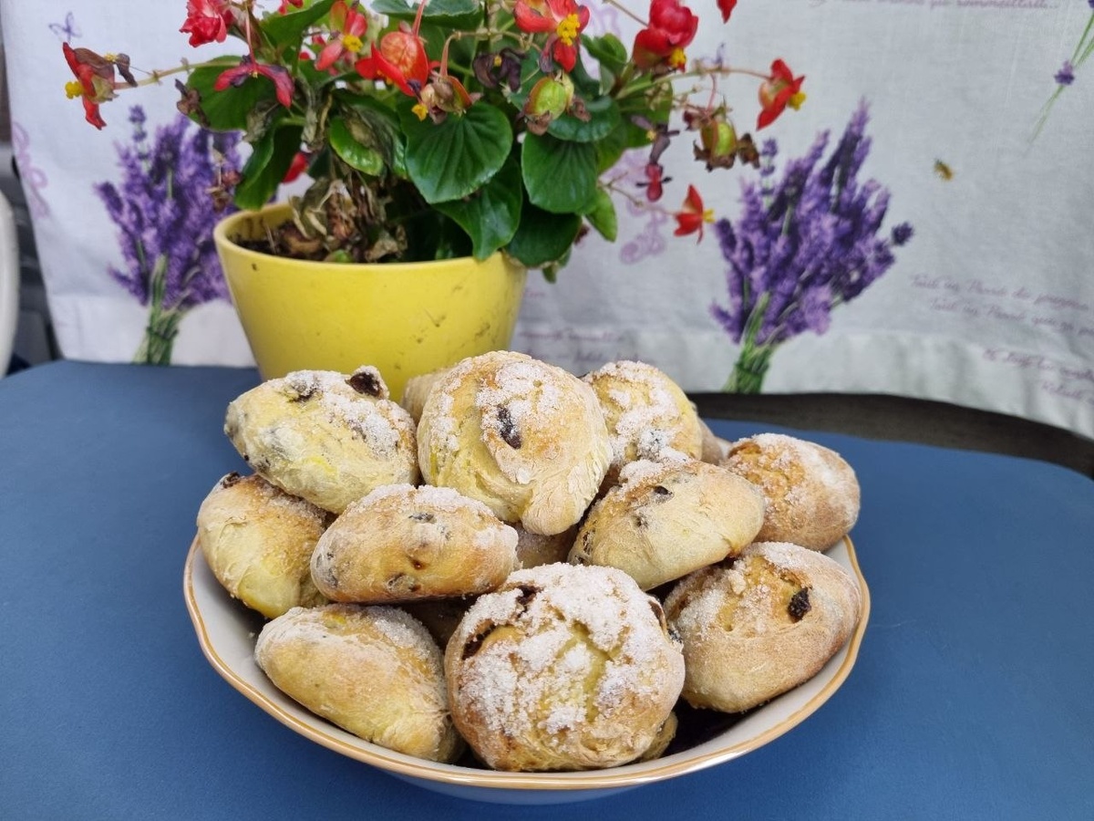 На примерно 40 булочек: 600 г тёплой воды 1 ч.л. соли 8-12 г сухих дрожжей или 1 пакетик гранулированных 600-800 г муки 125 г сахара 1,5 ст.л. оливкового масла 0,5 ч.л. шафрана 1 стопка водки или спирта 200 г изюма ⭐ Изюм промыть, залить водой или коньяком по желанию. Шафран залить водкой. ⭐Замесить тесто из тёплой воды, соли, 1 ст.л. сахара, соли, дрожжей и 375 г муки. Дать подняться 30 минут. ⭐ Сахар растереть с оливковым маслом, добавить водку с шафраном и мукой. Муку добавлять постепенно до того, как тесто будет отставать от рук. ⭐Всыпать изюм, ещё раз вымесить тесто, дать ему подняться второй раз. ⭐Духовку разогреть до 180°С. Противень выстелить бумагой для выпечки. ⭐Тесто выложить на посыпанную мукой поверхность. Разделить на шарики диаметром 3 см, выложить на противень, слегка придавливая серединку. Посыпать сверху сахаром. ⭐ Выпекать около 30 минут до золотистого цвета. Приятного аппетита! Подпишись, чтобы не потерять!