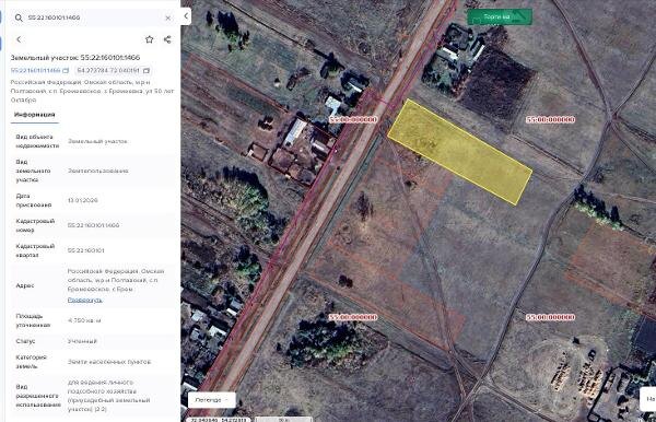Канал: Госземля Омская область Область: обл Омская Район: м.о. Полтавский район Населенный пункт: с. Еремеевка, ул 50 лет Октября Локация: Смотреть на карте ВРИ: Для ведения личного подсобного хозяйства (приусадебный земельный участок) Кадастровый номер: 55:22:160101:1466 Кадастровая стоимость: - Вид сделки: Аренда Площадь: 4750 м² Начальная цена: - руб. Дата завершения: 21.04.2026 Подробнее: ГИС ТОРГИ #госземля #земляотгосударства #земля #земельныйучасток #земельныеторги #торги #аукцион #арендаземли #аренда #омскаяобласть