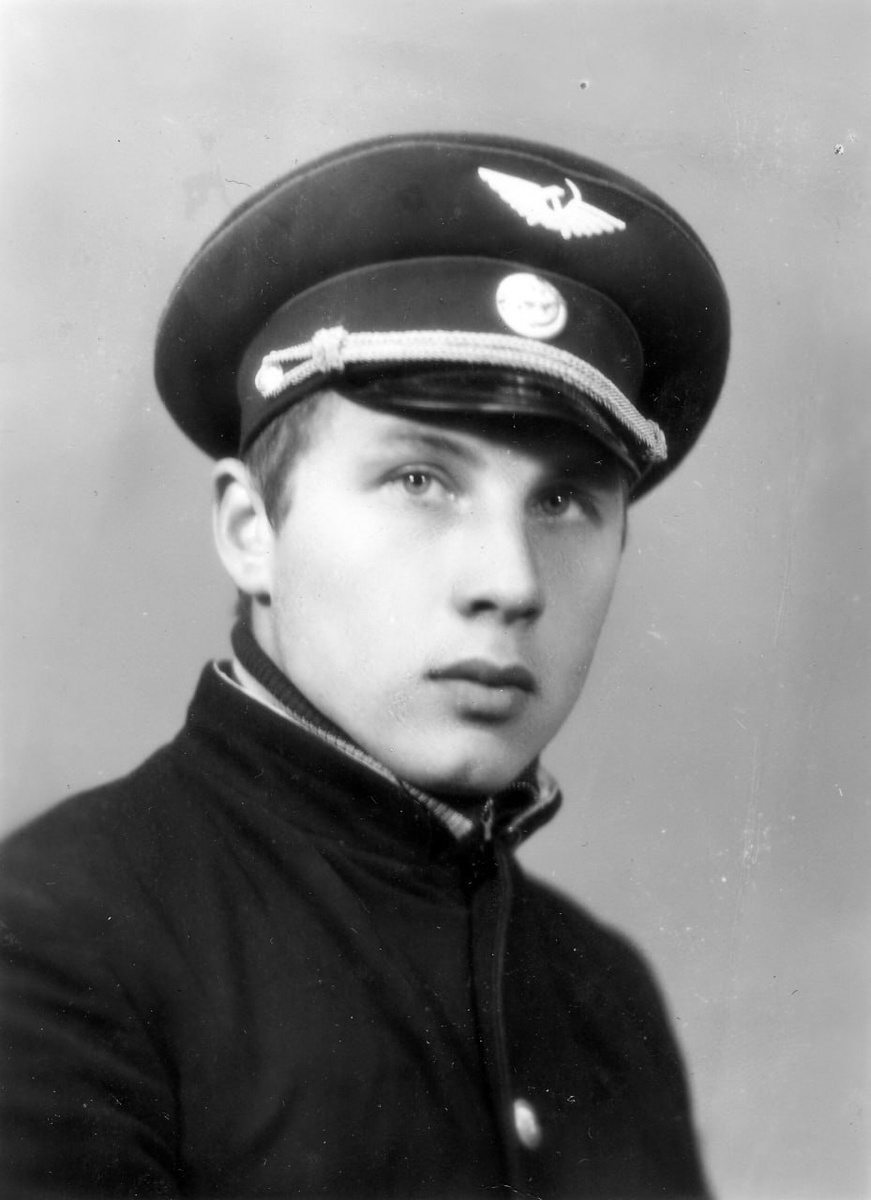 Студент училища гражданской авиации в кителе с воротником стойкой и фуражкой с эмблемой Гражданской авиации.