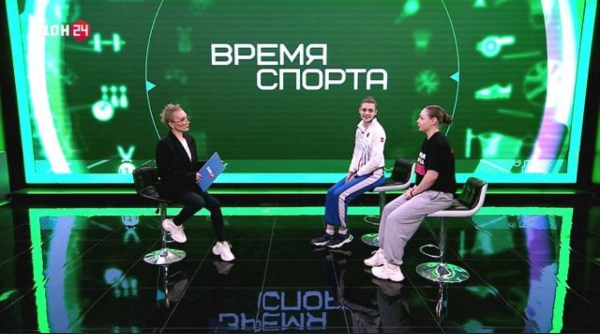 Тимур Дегтярев, Артем Егиян, Злата Дронова и ее тренер Валерия Щербакова в сюжете телеканала «ДОН 24».