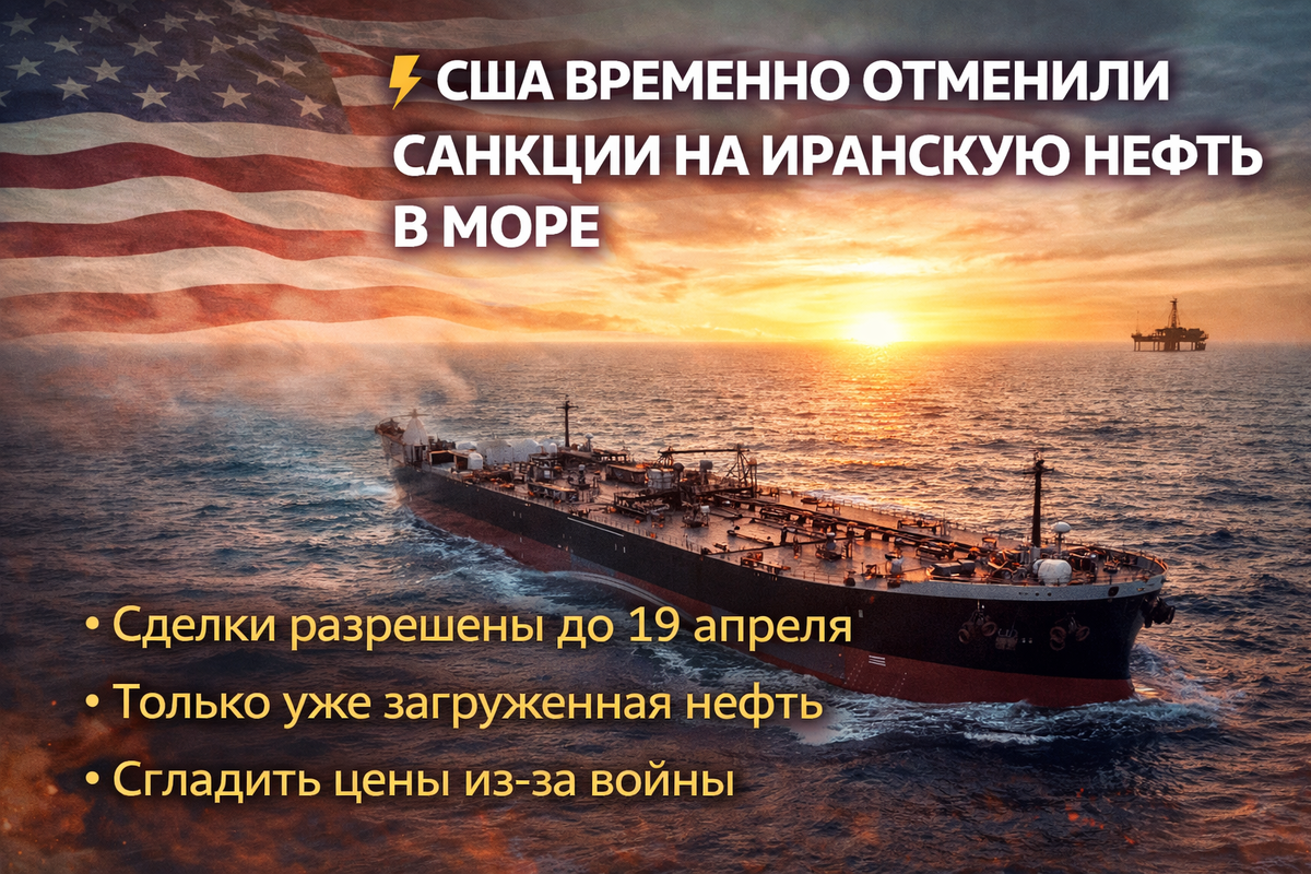 Вашингтон пошел на точечное послабление: администрация Трампа разрешила сделки с иранской нефтью, которая уже была загружена на суда по состоянию на 20 марта. Лицензия действует до 19 апреля и касается только тех партий, которые уже находятся в море, а не новых поставок.