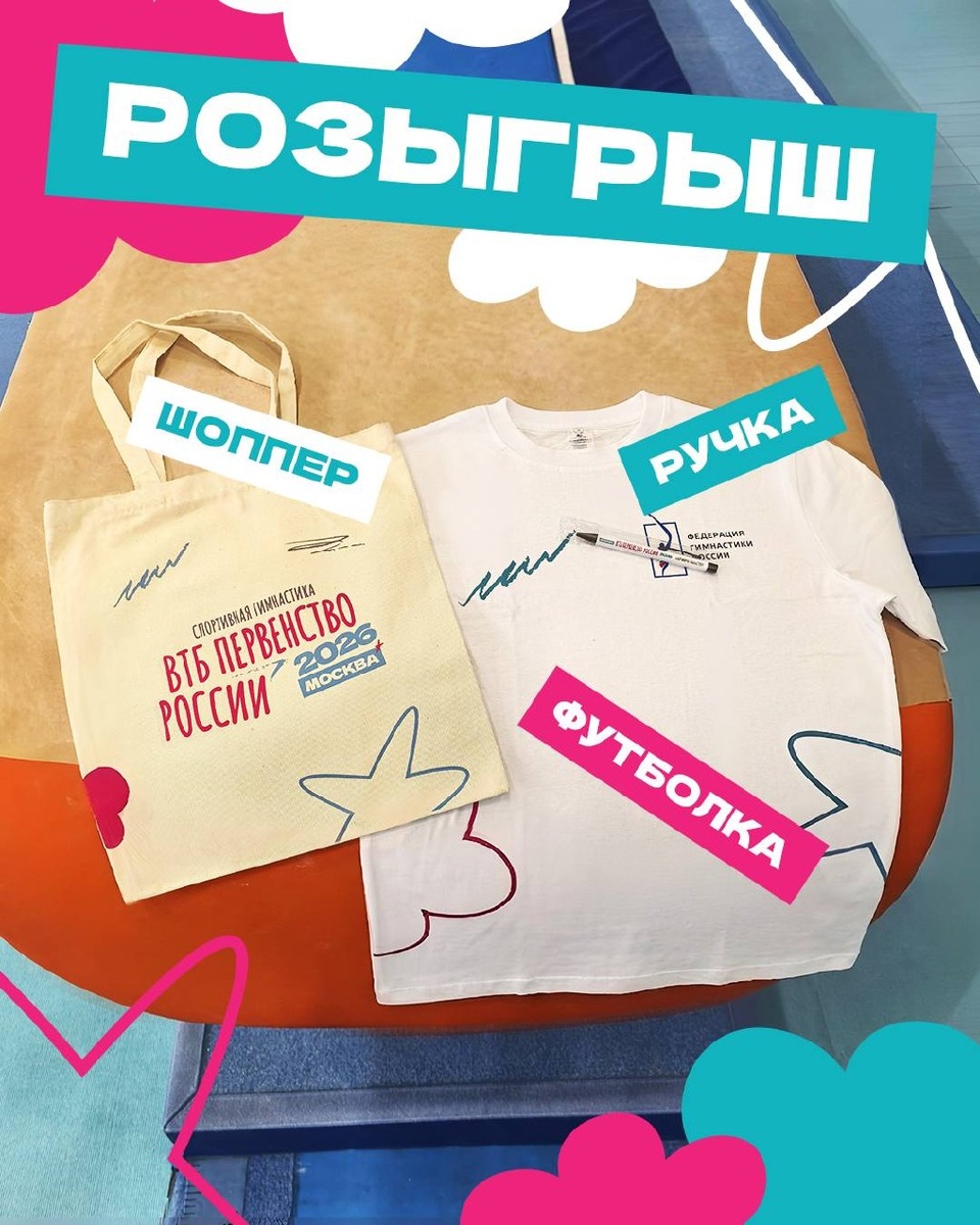 Дарим фирменные подарки ВТБ Первенства России 2026 по спортивной гимнастике! Победитель получит шопер, футболку и ручку.