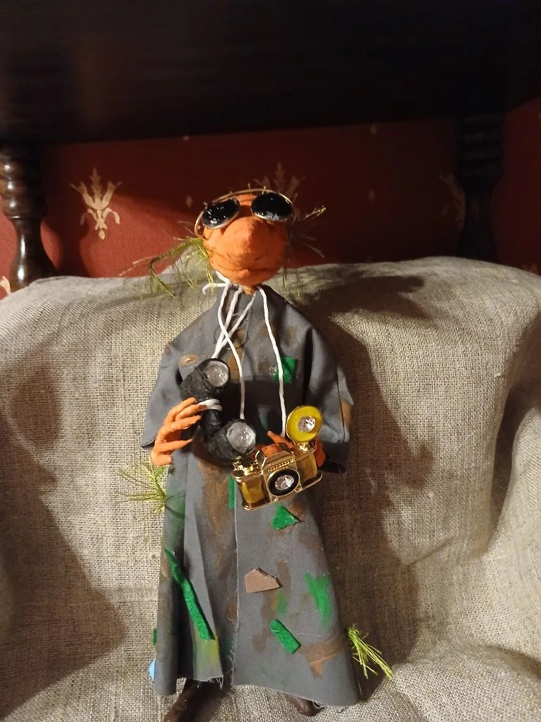 Сегодня, оказывается, мы отмечаем День кукол. По этому поводу, я вам хочу представить моего нового героя из сказки "Чиполлино". Только, Т-С-С! Он не должен знать, что я вам о нём рассказала. Его личность им же самим строго засекречена, несмотря на то, что он знаменитый сыщик Моркоу. Поэтому никто и не догадывается, где он сейчас ведёт расследование и как выглядит. Значит, я вам ничего не показала и не рассказала! Договорились? Оснащён он по полной. Есть в его арсенале мощный бинокль и современный фотоаппарат. Возможно, есть ещё что-то. мной не замеченное у него за пазухой. На то он и профессионал в сыскном деле. Как всегда, покажу его вам со всех сторон. Не смотрите, что у него такое грязное неказистое пальто. Это элемент маскировки. Пятна, мусор и даже пара окурков он приклеил на спину. В таком прикиде он ложится где- нибудь ничком и его можно принять за небольшой холмик. Однажды так, видимо, и произошло. Кто-то пр