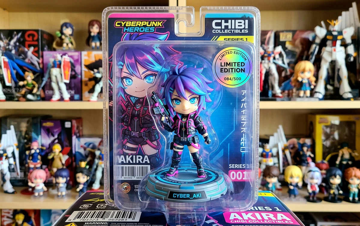 1. Ключевые слова: «chibi action figure collectible», «in packaging», «blister box», «holographic sticker», «toy photography aesthetic» — сразу задают коллекционный стиль.