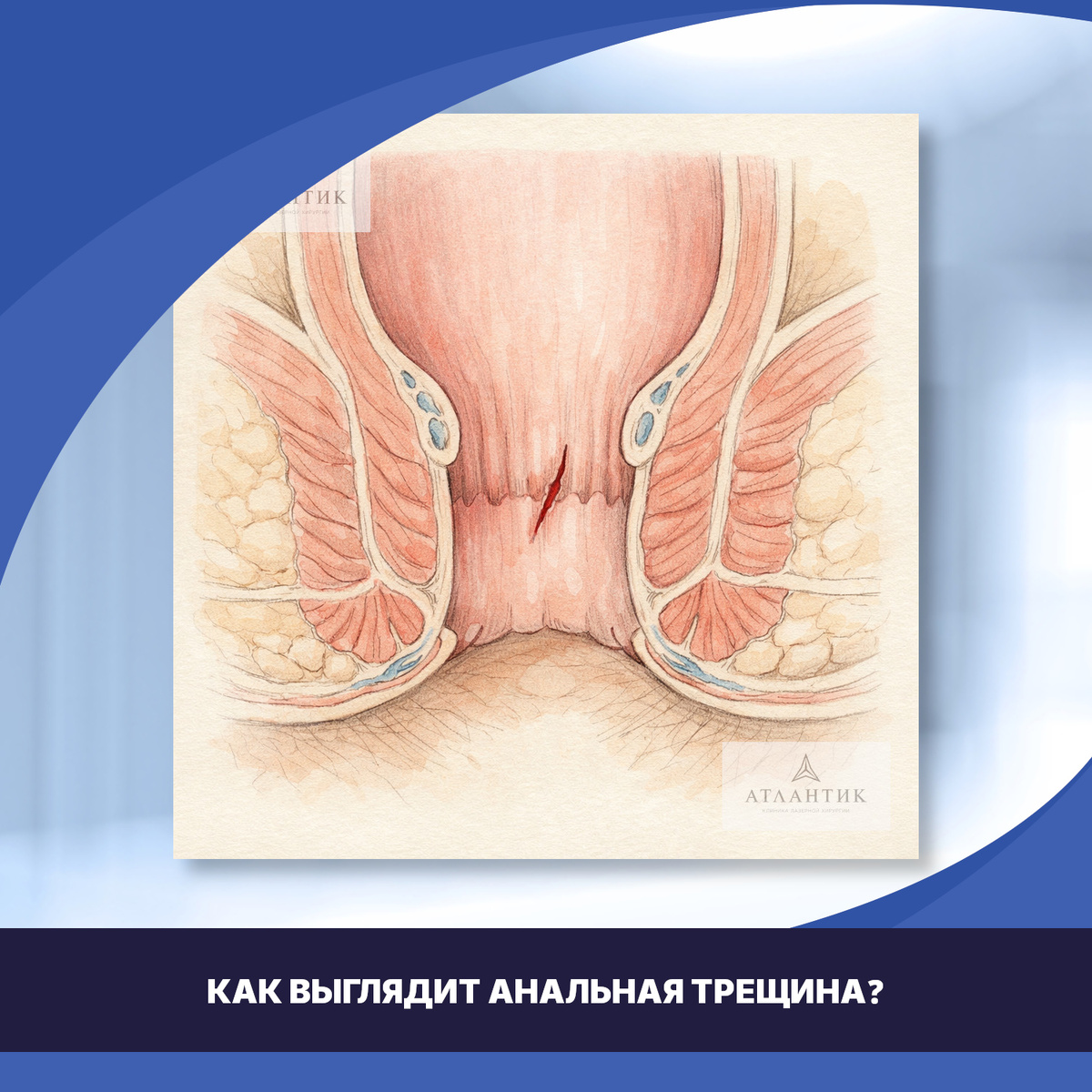 Анальная трещина — это продольный разрыв слизистой оболочки анального канала. Чаще всего трещина располагается по задней стенке анального канала и имеет линейную форму. При острой форме трещина выглядит как: Размер обычно небольшой — несколько миллиметров, но боль может быть очень выраженной. Важно: самостоятельно увидеть трещину сложно. Она расположена внутри анального канала и не всегда заметна при осмотре в зеркале. Данный материал носит исключительно информационный характер. Есть противопоказания, посоветуйтесь с врачом.