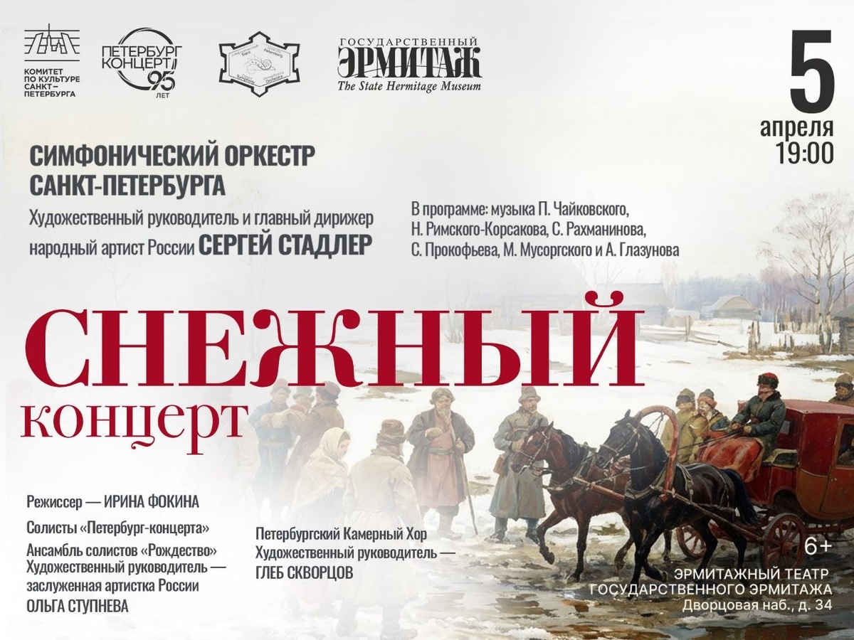 ! Музыкальный вечер Симфонического оркестра Санкт-Петербурга под руководством Сергея Стадлера с необычным для апреля названием «Снежный концерт» — гимн зиме, неоднократно воспетой в произведениях русской культуры. Программу составят известные и редко исполняемые сочинения отечественных композиторов, так или иначе связанные с зимним временем года. В программе прозвучат: вторая часть Симфонии «Зимние грёзы», роковая сцена Лизы и Германа у Зимней канавки из оперы «Пиковая дама» и фрагменты из музыки к весенней сказке «Снегурочка» Чайковского. Сцена «Проводы масленицы» и хор «А мы просо сеяли» из оперы «Снегурочка» Римского-Корсакова служат напоминанием о старинных обрядах русского народа. Три фрагмента «Лёд», «Град», «Снег» из балета «Времена года» Глазунова, «Вариация Феи зимы» из балета «Золушка» Прокофьева украсят программу вечера. Также в концерте будут представлены фрагменты из оперы «Хованщина» Мусоргского и сочинения Рахманинова. 6+ 05.04 | 19:00 | Эрмитажный театр