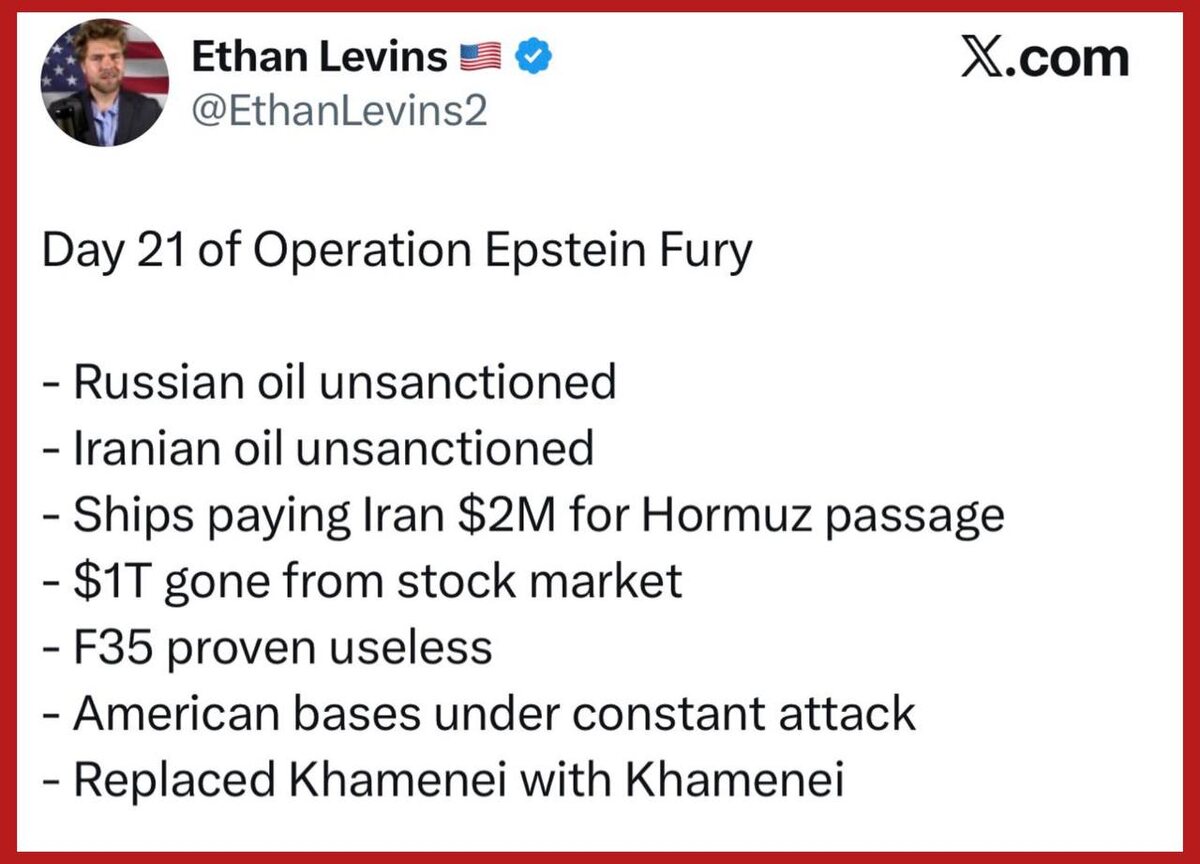 Двадцать первый день операции «Ярость Эпштейна»: - Российская нефть больше не под санкциями - Иранская нефть больше не под санкциями - Суда платят Ирану по $2 млн за проход через Ормузский пролив - С фондового рынка исчез $1 триллион - F-35 доказал свою бесполезность; - Американские базы находятся под постоянными атаками Ирана; - Хаменеи заменили… на Хаменеи 🔺Думаю, журналист просто не все знает. Уверен, Трамп и его друзья неплохо заработали. Тот самый триллион не воздухе растворился, а осел на чьих-то счетах. Телеграм-канал Александр Семченко